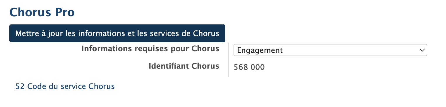 Mettre à jour les informations et les services de Chorus, vous allez automatiquement récupérer l'identifiant Chorus de la structure et tous les codes services associés à celle-ci. Attention pour faire cette opération le SIRET de la structure doit être correctement renseigné au préalable.