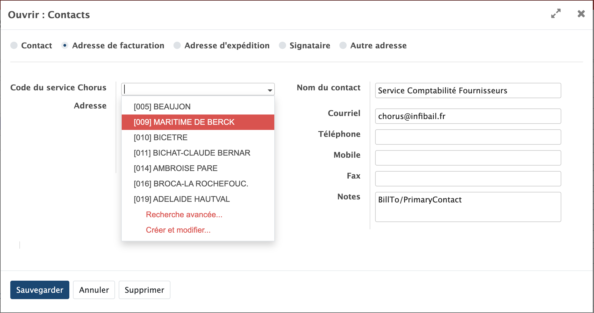 Si vous avez choisi de passer le code service, celui-ci devra être renseigné sur l'adresse de facturation vers laquelle vous allez envoyer vos factures