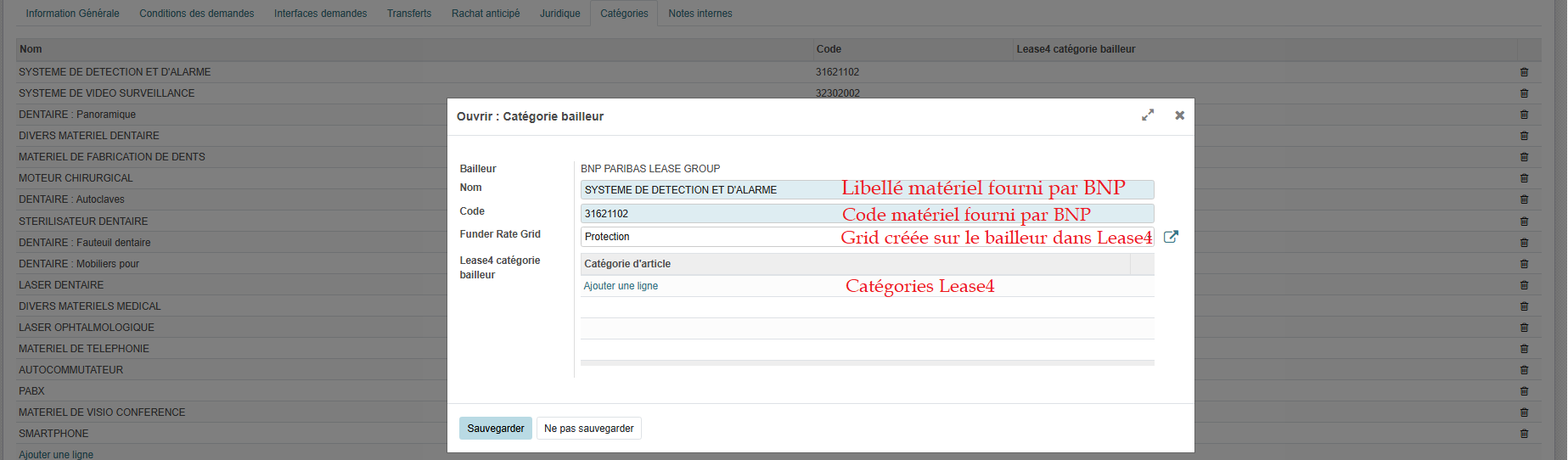 Lease4 > Refinancement > Configuration > Bailleur > catégoriesL'association des catégories bailleurs avec les catégories loueurs sont indispensables lors de l'utilisation des API.