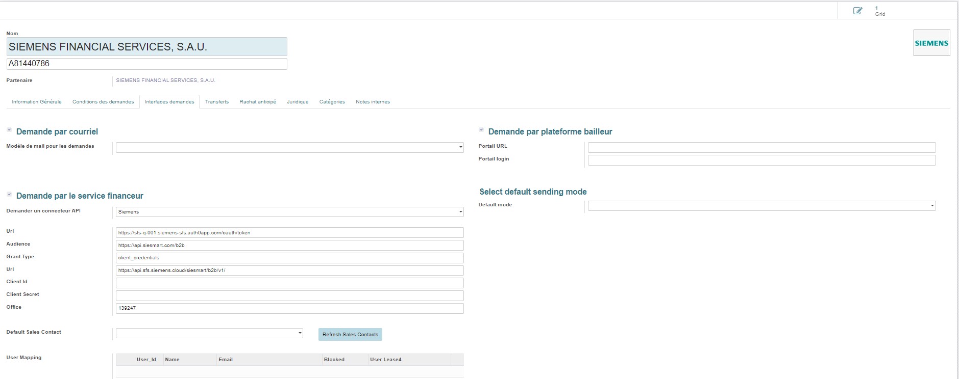 - Default Sales Contract : Si le mapping des comptes n'a pas d'utilisateur Lease4 alors on utilise cet utilisateur